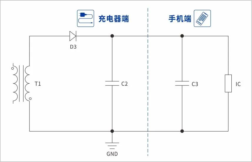 充電過程中,在某一瞬間T1原邊給副邊提供電磁能量,如果在斷開充電的時候副邊沒放電完的能量能夠乖乖的返回原邊那也就罷了,然而存在漏感,一部分能量會繼續(xù)往手機端跑,我們把原理再簡化一下。