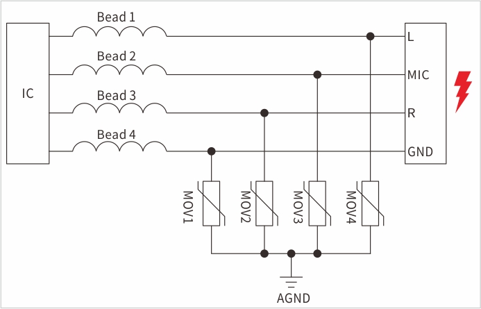 原理如(圖2),左邊是音頻解碼芯片,客戶串聯(lián)30歐姆的磁珠,接口采用高VC低IPP封裝0402的壓敏器件,右邊是耳機(jī)音頻接口。