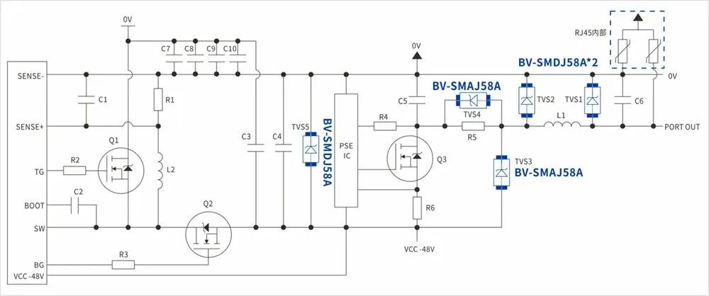 從原理圖上看,為了做好防護,在POE電源口做了兩級TVS 的防護,從應用電路上看,規(guī)劃的路徑是在接口處,IC的輸入前,將過電壓能量抑制在一個較低的水平,通過實際測試,PSE IC損壞。