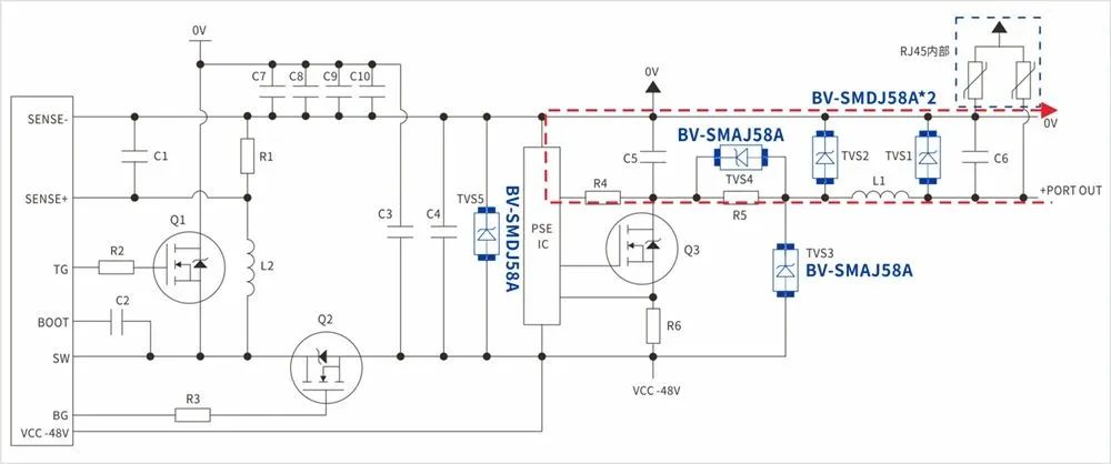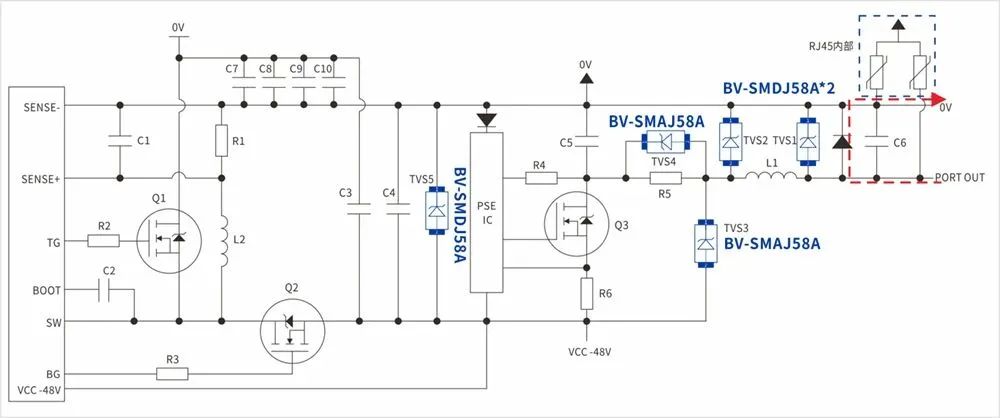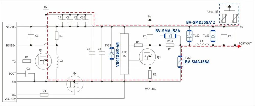 某客戶,在按照ITU-T K.21測試要求的測試應力測試POE網(wǎng)口時,出現(xiàn)POE網(wǎng)口損壞。表現(xiàn)為PSE IC損壞,無輸出。其防護的電路基本框圖如下:
